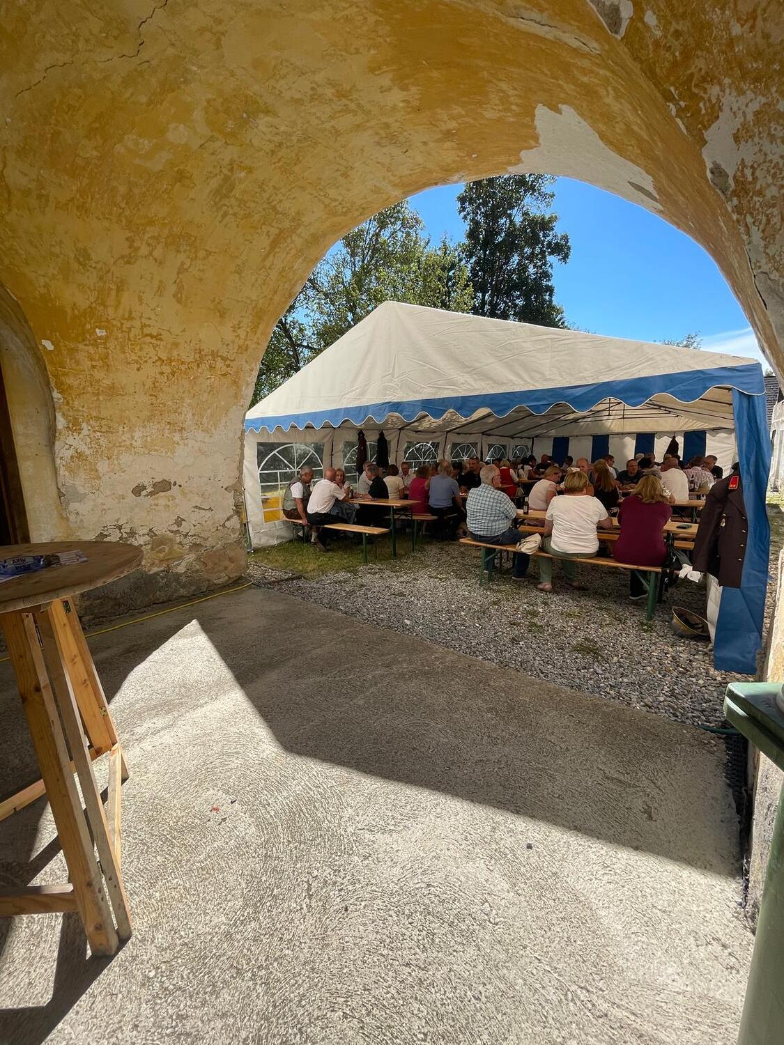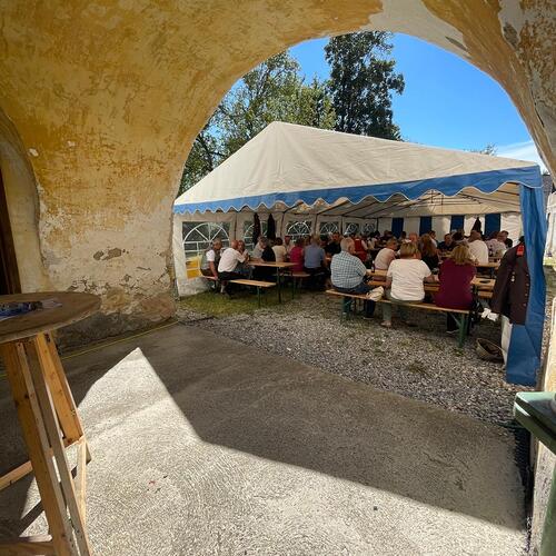 Im Anschluss wurde in den Pfarrgarten zum kulinarischen Wohl im Pfarrgarten eingeladen, bei der die zahlreichen MessbesucherInnen mit Grillhendl, Würstel, Pommes und Sturm bewirtet wurden. Im Pfarrhaus gab Torten, Kuchen und Kaffee.